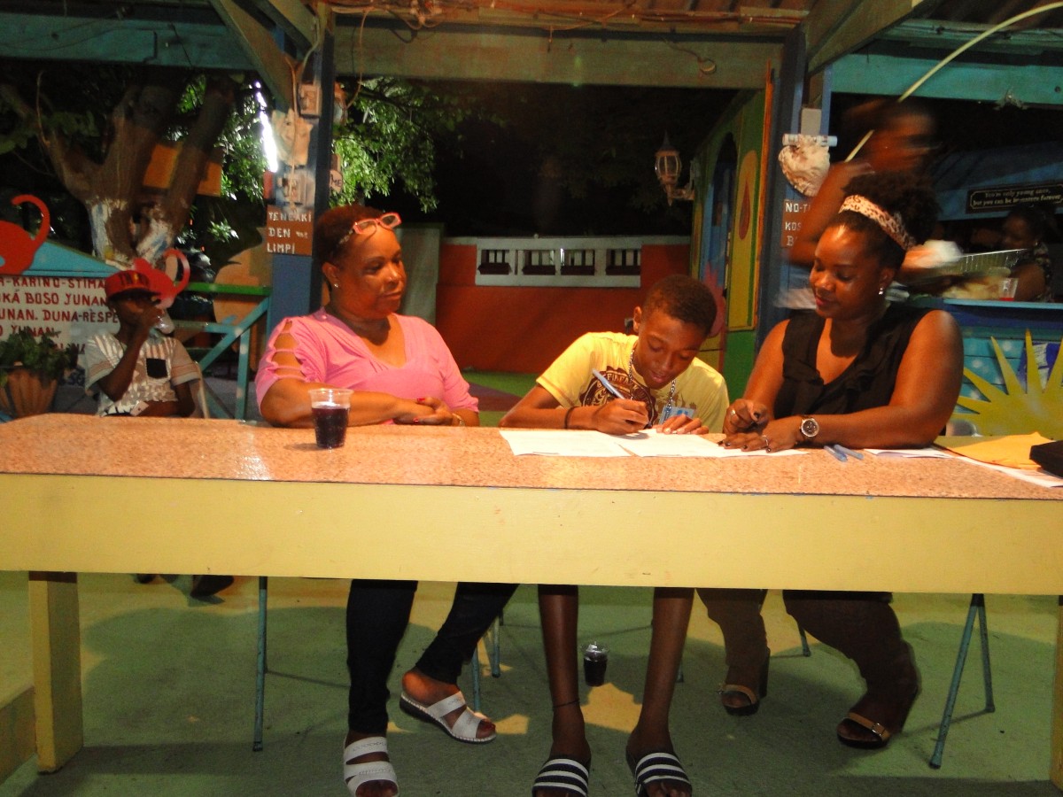 Met het tekenen van de bruikleenovereenkomst voor de laptops en het bekendmaken van het lesschema is op 1, 3 en 5 augustus Nos ta Konektá 2016/17 officieel van start gegaan voor de in totaal 30 jongeren uit de wijken Souax, Ser’ i Domi en Nieuw Nederland. Tijdens de informatieavond hebben de jongeren meer inhoudelijke informatie over het project gekregen en hebben ze kennis gemaakt met hun docent en de buurtmoeder. De jongeren zijn enthousiast en kijken vol nieuwsgierigheid uit naar de lessen. Hieronder een impressie van de drie avonden.