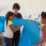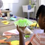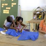 5 kinderen van Groep A op bezoek bij de Tinkersjop. De opdracht was om een parachute te maken. De kinderen moesten zelf uitvogelen wat het beste ontwerp is.