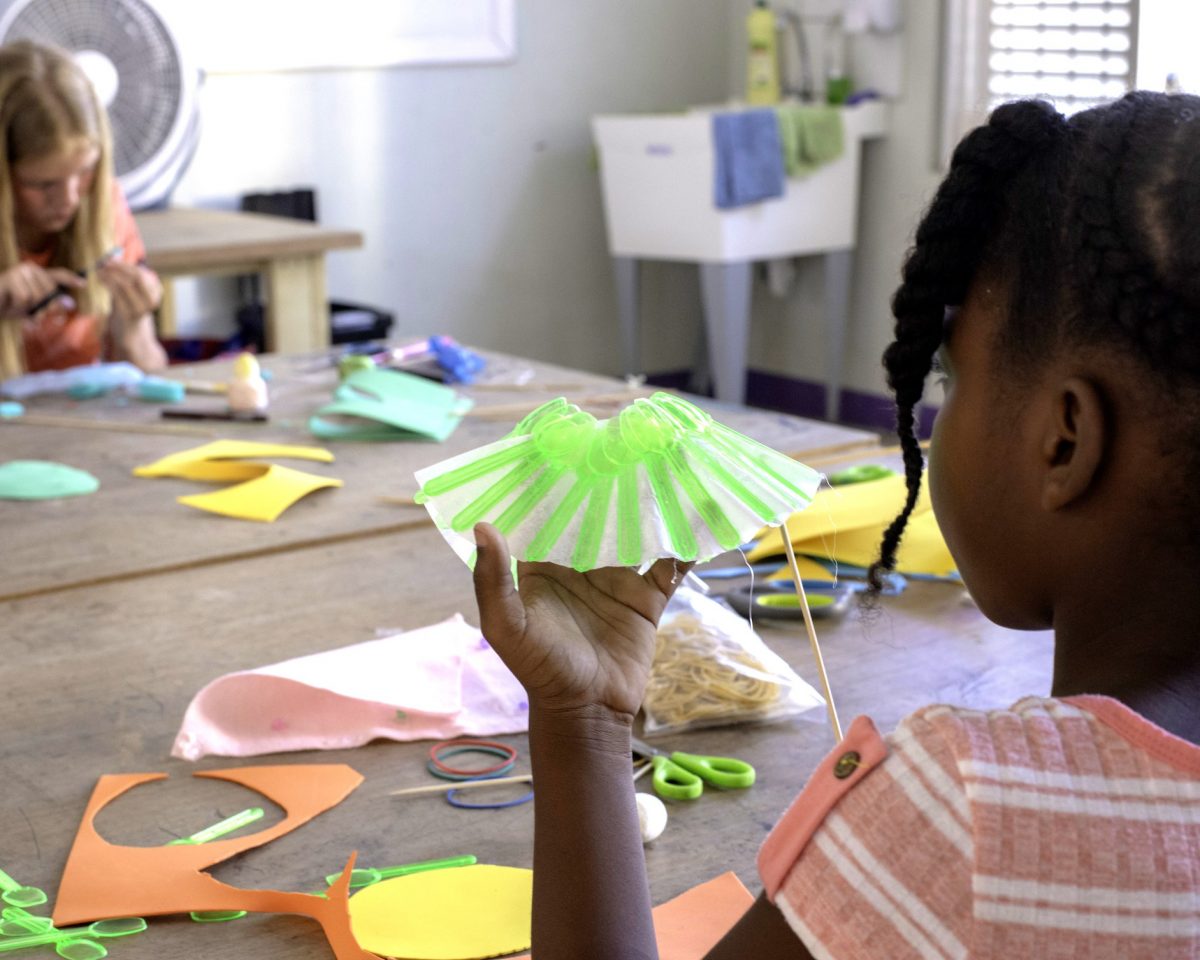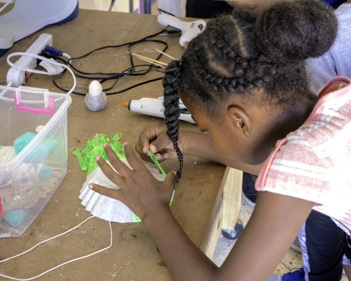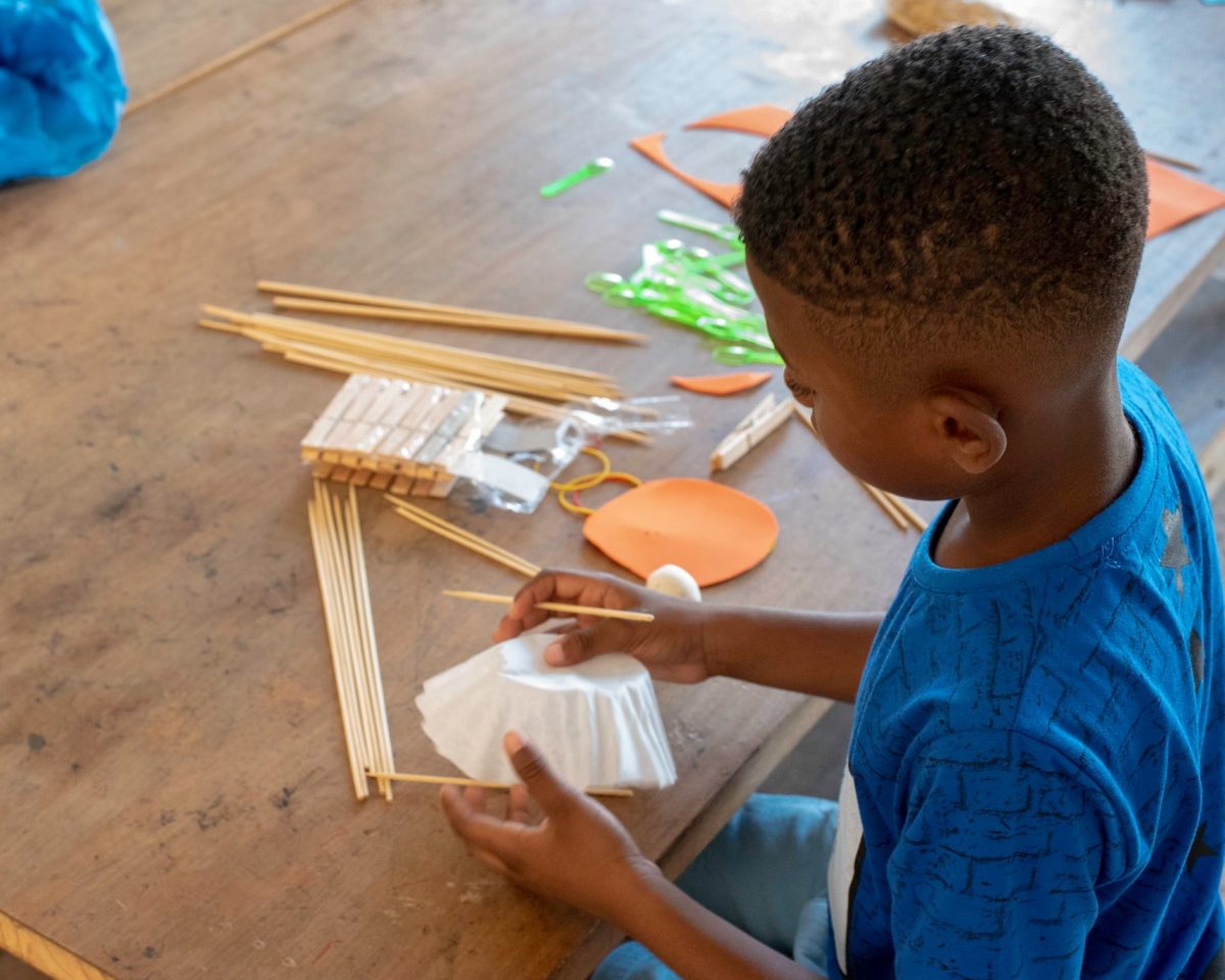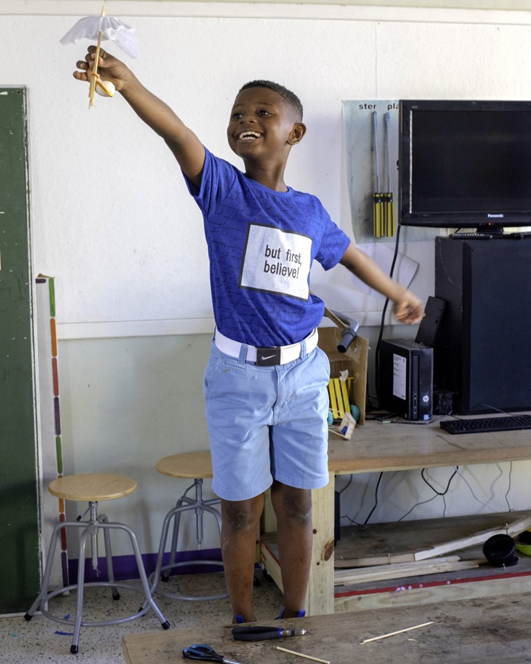 5 kinderen van Groep A op bezoek bij de Tinkersjop. De opdracht was om een parachute te maken. De kinderen moesten zelf uitvogelen wat het beste ontwerp is.