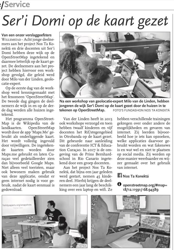 Na een workshop door expert Milo van der Linden, hebben de kinderen hun eigen buurt op Open Street Map gezet. Het resultaat is te bekijken op: https://www.openstreetmap.org/#map=18/12.11591/-68.94389 en ook door degenen die Maps.Me gebruiken op hun smartphone.